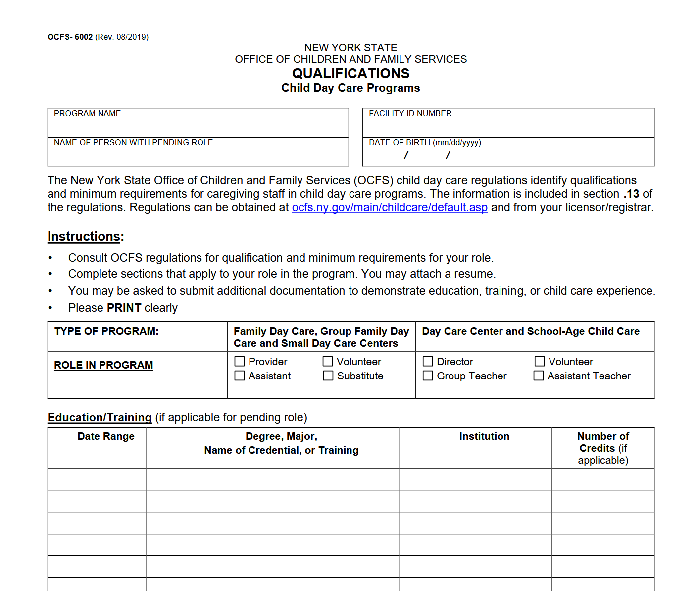 OCFS-6002 - Qualifications-Child Day Care Programs