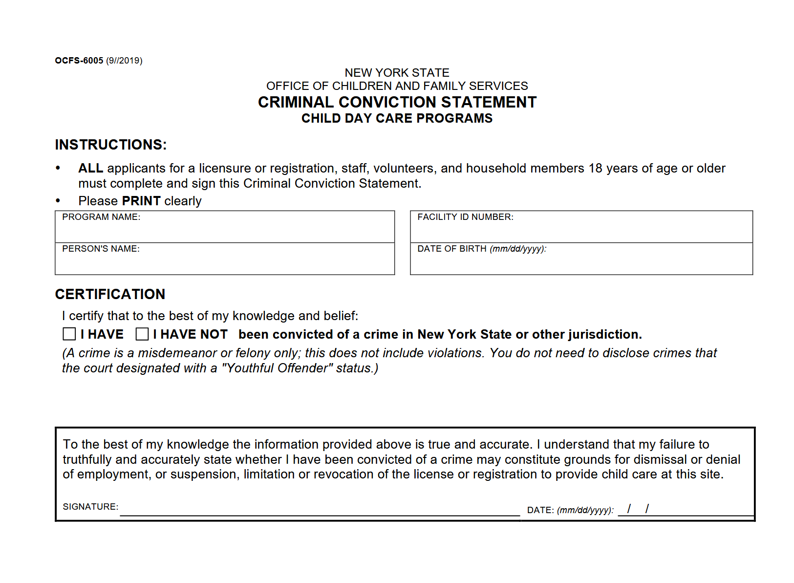 OCFS-6005 — Criminal Conviction Statement (New York State Child Day Care Programs)