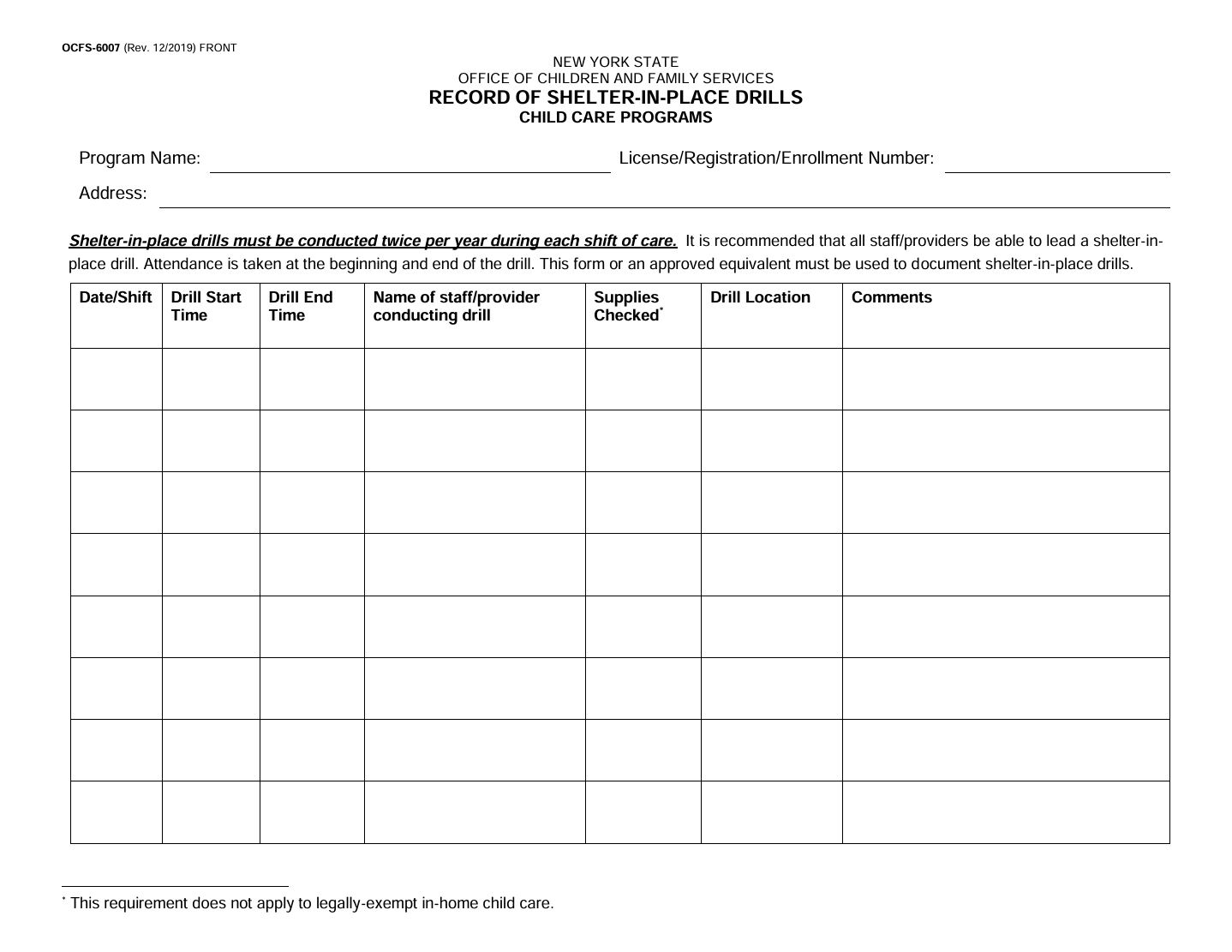 This official New York State Office of Children and Family Services (OCFS) form is used by licensed child care programs to record shelter-in-place drills. Administrators and caregivers fill it to track staff participation, ensure safety compliance, and document emergency preparedness exercises. Maintaining accurate records is legally required, helps evaluate staff readiness, and ensures all safety protocols are followed. Key terms: shelter-in-place drill, child care safety, OCFS compliance, emergency preparedness.