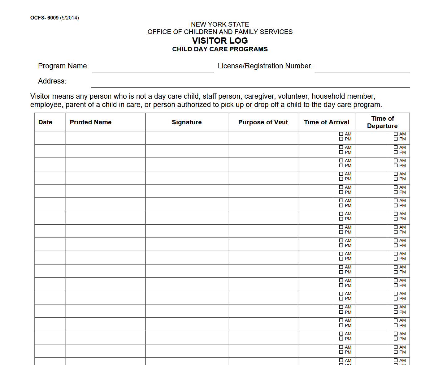 OCFS-6009: Visitor Log for Child Day Care Safety Compliance New York State