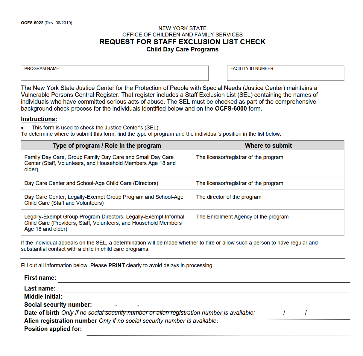 The OCFS-6022 Request for Staff Exclusion List Check is an official New York State form used by child day care programs to verify whether an individual appears on the Staff Exclusion List (SEL) maintained by the New York State Justice Center for the Protection of People with Special Needs. The SEL identifies individuals found responsible for serious acts of abuse or neglect, and checking it is a required step in the comprehensive background check process for child care personnel.