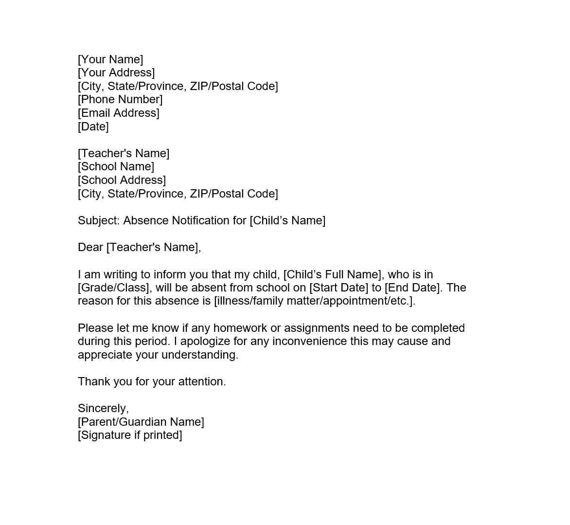 [City, State/Province, ZIP/Postal Code]Subject: Absence Notification for [Child’s Name]