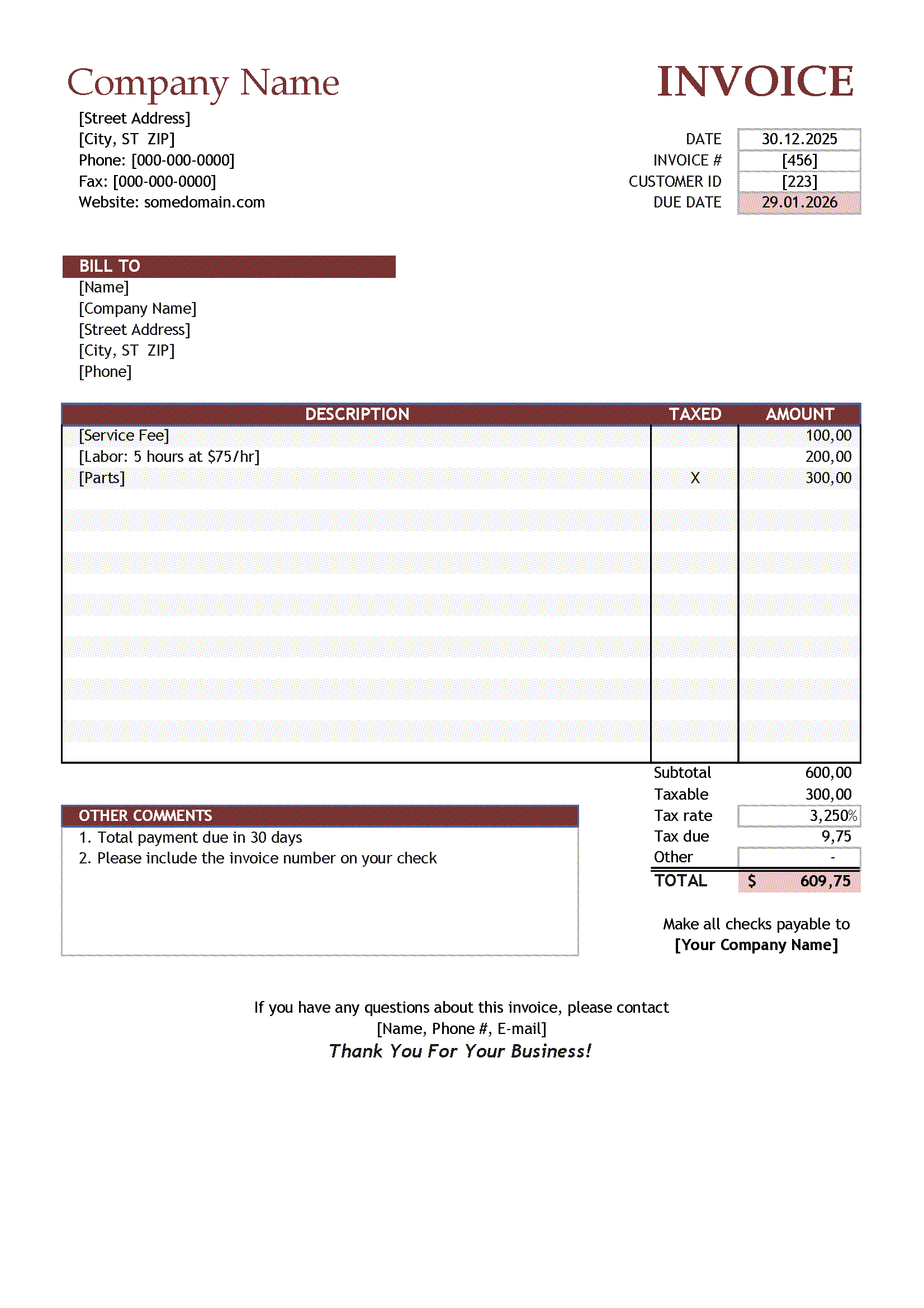 - Payment terms and signature area (optional)