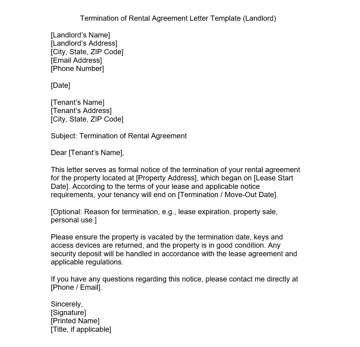 This letter serves as formal notice of the termination of your rental agreement for the property located at [Property Address], which began on [Lease Start Date]. According to the terms of your lease and applicable notice requirements, your tenancy will end on [Termination / Move-Out Date].