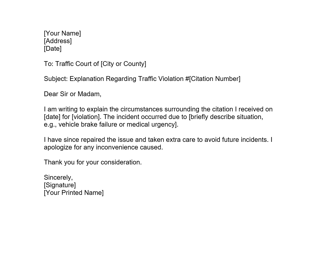 A Traffic Violation Explanation Letter helps clarify the context behind a traffic infraction. It’s suitable for cases where you admit the offense but wish to provide reasoning (e.g., medical emergency, sudden car malfunction, or confusing road markings).