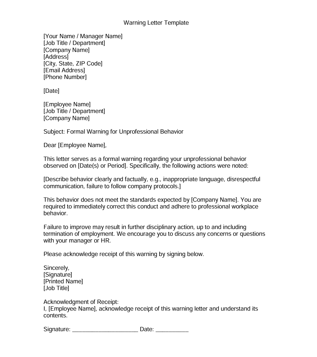This letter serves as a formal warning regarding your unprofessional behavior observed on [Date(s) or Period]. Specifically, the following actions were noted: